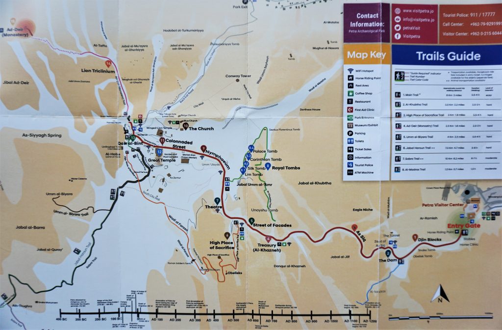 Vandaag ga je naar de Monastery (het klooster) vanaf de achterkant van Petra (deze route staat niet op de kaart hieronder) en bezoek je de High Place of Sacrifice (de hoge offerplaats). Dat zijn je hoogtepunten van Petra deze dag.