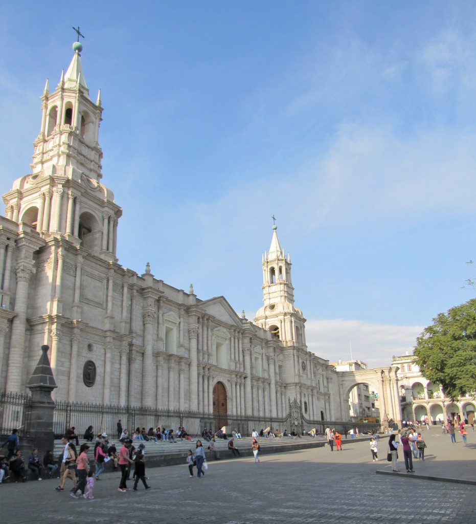 De witte stad op haar mooiste! De symmetrische bogen en de prachtige kathedraal maken echt indruk. Het is altijd druk op het plein. Hordes mensen zitten in de schaduw voor de kerk. Op het plein zelf proberen beginnende gitaarspelers een aantal sol bij elkaar te pingelen en worden hartstochtelijke religieuze lezingen gegeven. Voor alle toeristen bezienswaardigheden kun je terecht op het plein. Aan de rechterkant van het plein (als je met je rug naar de kathedraal staat) worden door elke touroperator dezelfde tours aangeboden. Aan de linkerkant vind je de handicrafts market waar je een lamasleutelhanger of een warme poncho kunt kopen.